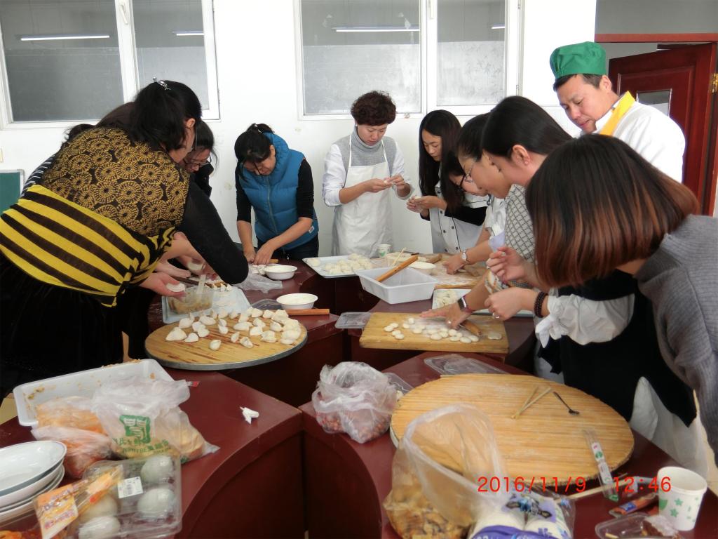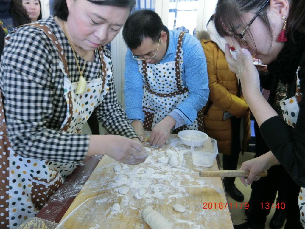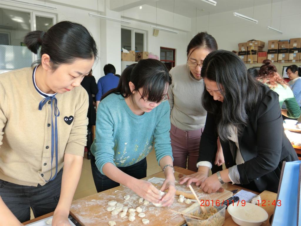 “包真心,展厨艺,浓真情”,为了增进外语学院教职工间情感的交流和发展,提升外语学院教职工的凝聚力和向心力,2016年11月9日,外语学院成功举办了“外语学院教职工首届劳动技能大赛之包饺子大赛”,比赛由学院分工会委员魏薇老师主持,校工会副主席周鸿武、潘月秋莅临比赛现场担任评委。