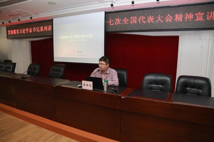 宣讲会邀请《工人日报》黑龙江记者站站长张世光为主讲嘉宾,作了习近平总书记系列讲话和中国工会第十七次全国代表大会精神的主题宣讲。张世光用大量的历史数据和独特的媒体视野,结合高校工会工作实际,从工会面临的背景和挑战、如何创新性开展工作、多举措打造亮点等方面进行了宣讲。他指出,中国工会第十七次全国代表大会是在我国进入全面建成小康社会决胜阶段、中国特色社会主义进入新时代大背影下,工运事业和工会工作具有里程碑意义的标志性盛会。大会的成功召开,为新时代工运事业和工会工作创新发展指明了前进方向,提供了根本遵循,为今后工运事业和工会工作提供了行动纲领和指南。