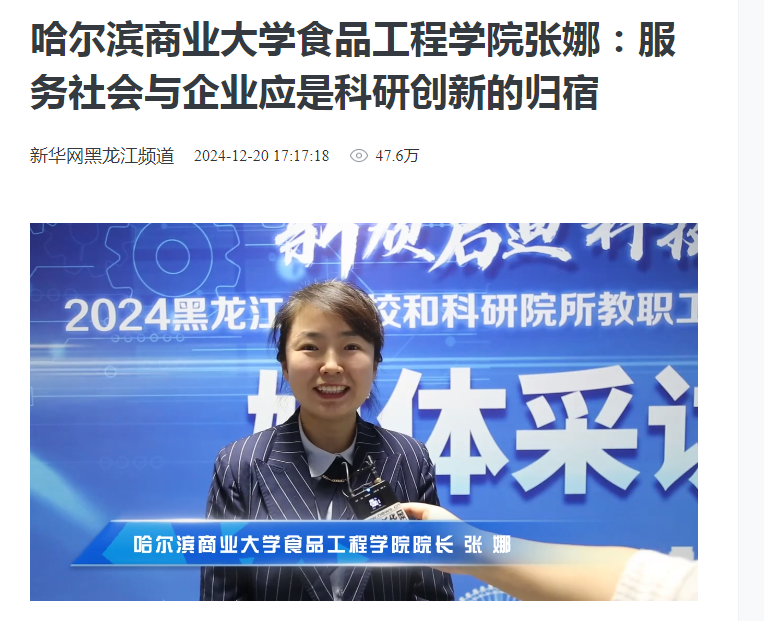 12月20日,“新质启迪,科技焕新”2024黑龙江省高校和科研院所职工科技创新成果转化大赛落幕。经过激烈角逐,我校食品工程学院张娜、药学院汲晨锋、食品工程学院赵凯分获大赛一、二、三等奖,赛后,张娜教授代表全体获奖选手接受了新华网采访。