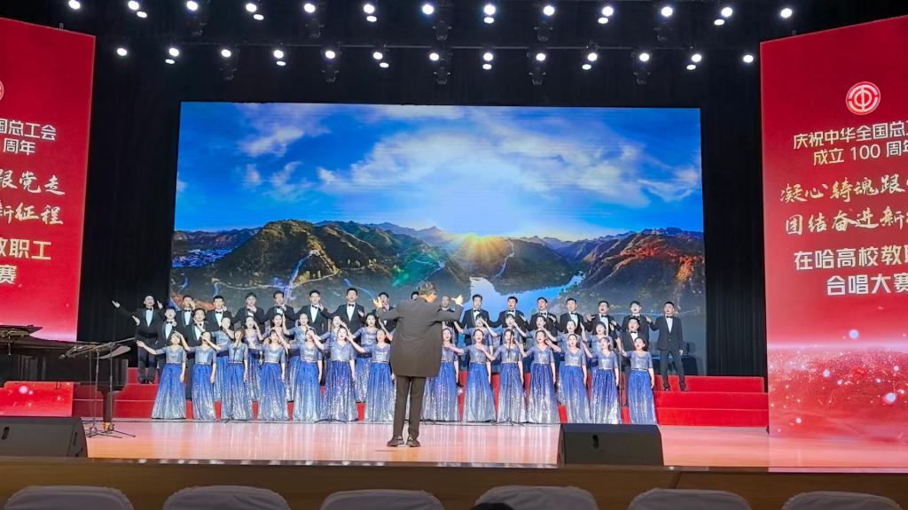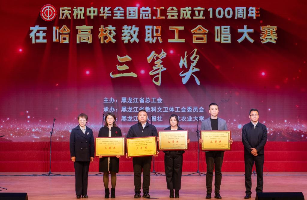 5月16日,由省总工会主办,省教科文卫体工会承办,黑龙江工人报社、东北农业大学协办的庆祝中华全国总工会成立100周年暨“中国梦·劳动美——凝心铸魂跟党走 团结奋进新征程”在哈高校教职工合唱大赛决赛在东北农业大学音乐厅举行,有晋级决赛的12支代表队的600余名教职工同台竞唱,用饱含深情的歌声为“百年工运”献上最诚挚的祝福。经过激烈角逐,我校代表队荣获大赛三等奖。